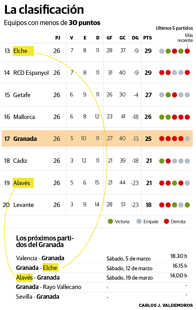El primer rival directo en visitar el Zaidín será el Elche, en dos jornadas. Será la siguiente final del Granada en casa. Los ilicitanos reciben este fin de semana al Barcelona de Xavi tras sufrir un duro varapalo al ser barridos por el colista, el Levante, pese a haber vencido al Rayo días atrás. En el Martínez Valero esperan a Mallorca y Getafe, este en la última jornada, aunque antes deberán ir a Cádiz. La mejoría experimentada por Francisco Rodríguez a su llegada tiene al equipo decimotercero con 29 puntos, tantos como el Espanyol.