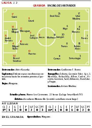 Queda por analizar cómo se presentará el Racing de Santander en el coliseo del Zaidín. Los cántabros, un conjunto recién ascendido, demostraron rigor en su partido en el El Sardinero, pero un par de arrebatos de talento del Villarreal B –que visitará Los Cármenes en la siguiente jornada– les hicieron morder el polvo en el tiempo añadido del segundo tiempo. Mucho ojo al exrojiblanco Matheus, capaz de cualquier cosa en el área. La previsión es que los visitantes monten una tela de araña que comprometa a los anfitriones.