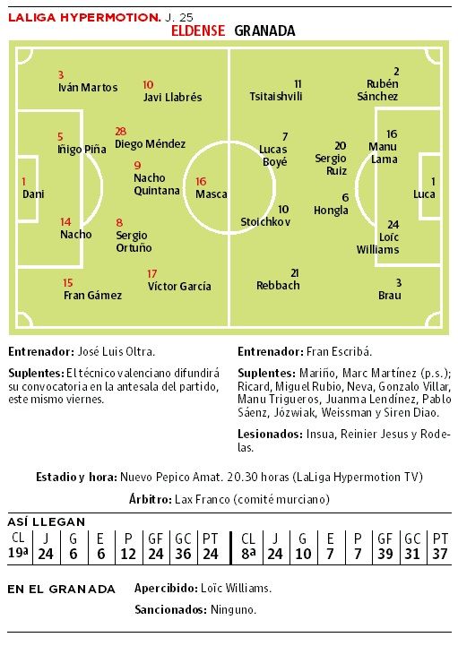 Si Fran Escribá así lo estima, podrá envidar en Elda con su nuevo 'póker' ofensivo gracias a sus dos cartas nuevas. Abde Rebbach ya asomó ... en su ramillete inicial contra el Sporting de Gijón y «Juan», el nombre real y como llama él al apodado como Stoichkov, tuvo minutos en la segunda parte, en los que mezcló muy bien con Lucas Boyé, aunque luego el gaditano de pelo teñido de rubio platino fallara con la espada. A ellos seguramente les acompañará Tsitaishvili, al que se le resiste el gol pese a sus muchas intentonas eléctricas desde la derecha. Un cuarteto que, en definitiva, ha de conjugar sobre el Nuevo Pepico Amat, el campo de un rival que comprometió el triunfo rojiblanco en Los Cármenes durante la primera vuelta y que ahora, con un exnazarí como José Luis Oltra, quiere escapar de los cuatro puestos que descienden. La etapa del valenciano arrancó bien, con un triunfo en Tenerife.