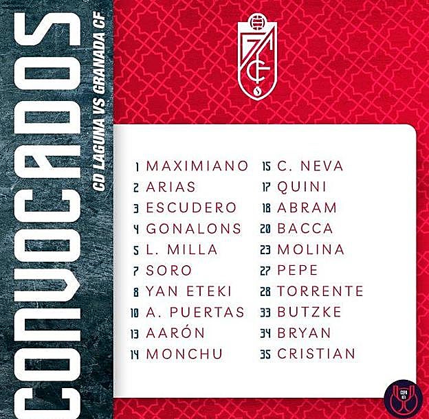 El Granada inicia su andadura en la Copa del Rey frente a un humilde club canario y seis canteranos en su lista de convocados. Los ... rojiblancos afrontan la primera eliminatoria de la competición del KO, a partido único, contra el Laguna, conjunto de la Regional Preferente. En su alineación, Robert Moreno puede incluir a algunos de los jugadores del Recreativo que ha incluido en su citación. Dos se han hecho habituales en sus entrenamientos: el central Torrente (titular en San Mamés) y el delantero Butzke, aún sin debutar. Otro tuvo mucho vuelo con Diego Martínez: el defensa Pepe. Otros dos han sido incluidos en el grupo de disponibles por primera vez: los extremos Bryan Zaragoza y Cristian Gutiérrez.