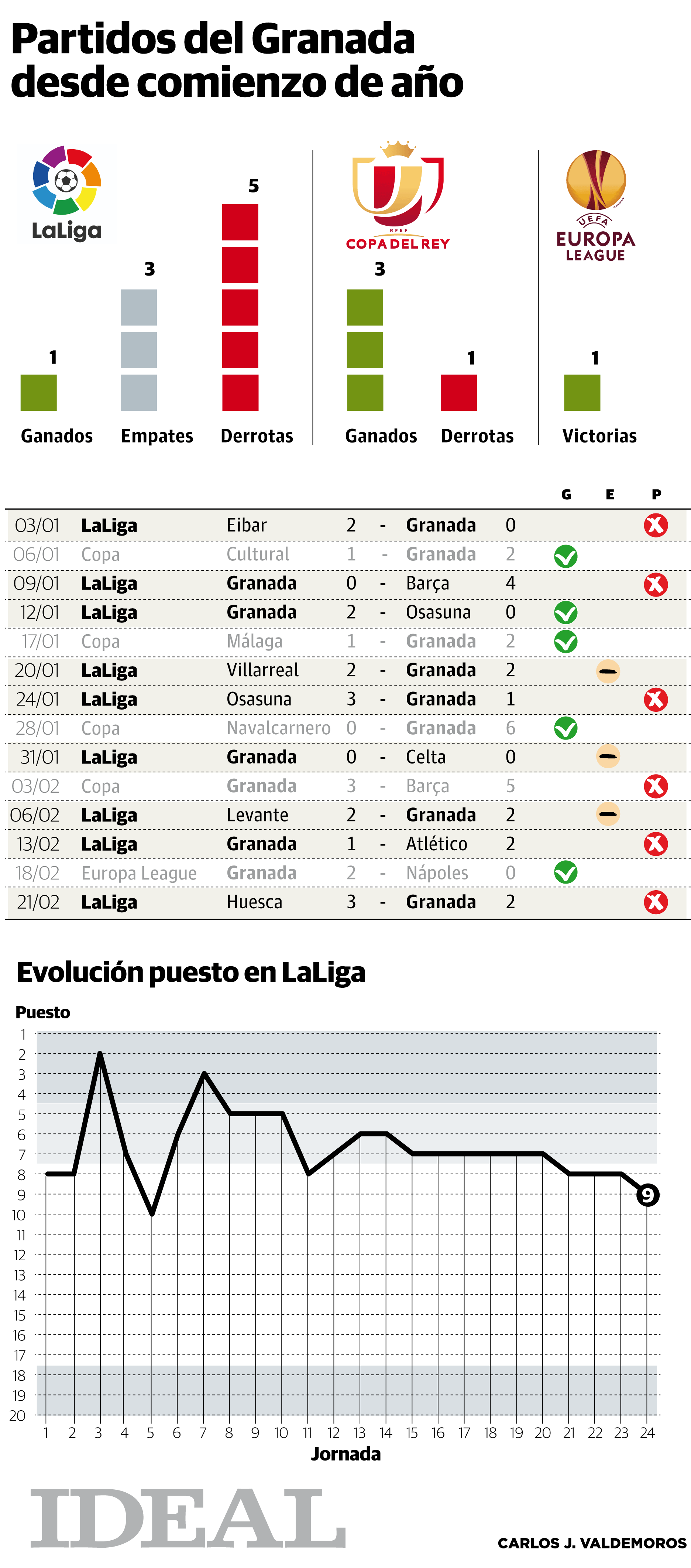 El panorama es el que es y tampoco da como para escandalizarse. El Granada está noveno en la clasificación, con 30 puntos, nueve de margen respecto al tercero por la cola, que es el Elche, el próximo visitante de Los Cármenes, el próximo domingo. Llegará tras lo de Nápoles, fiesta o entierro, y a los rojiblancos les tocará doblar turno o volver a tirar de interinos. Es la disyuntiva frecuente de esta temporada sobrecargada, en la que el equipo lleva más encuentros, 39, que los que tiene un campeonato convencional en Primera división.