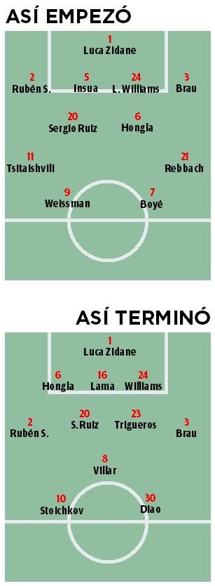 Escribá también dio entrada a Reinier en la banda izquierda, aunque se movió al centro cuando la jugada lo requirió. El brasileño se lesionó después y el equipo se recompuso con una zaga de tres con carrileros donde debutó Lama. Villar sumó y Diao cogió sensaciones tras su lesión.