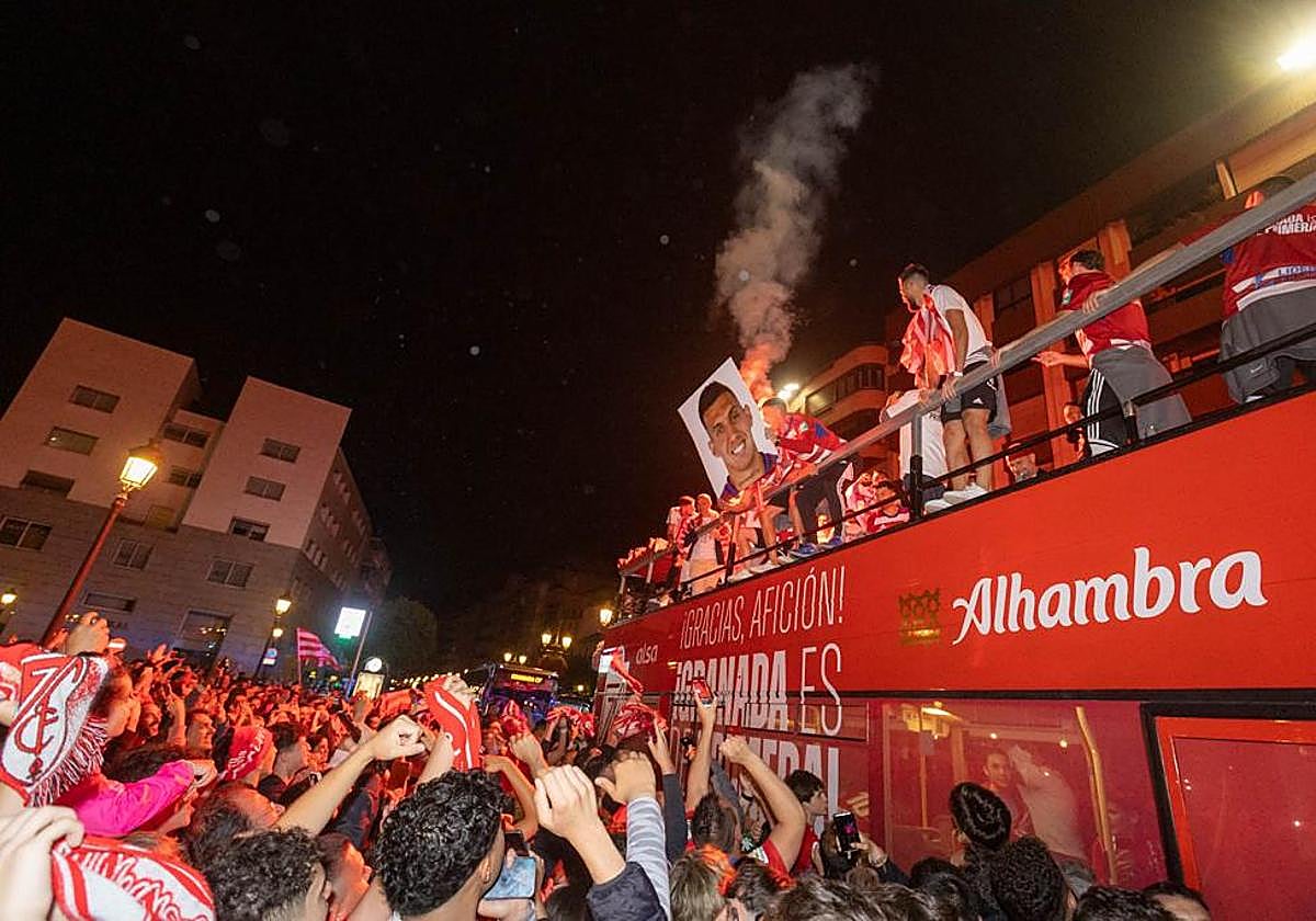 El bus del Granada tomó velocidad tras llegar a Neptuno mientras la gente comenzaba a agolparse en el entorno del hotel Barceló. Los jugadores del Granada descendieron entre aficionados del equipo, que gritaban a los héroes del ascenso. Accedieron como pudieron al hotel, donde la fiesta continuó de forma privada.