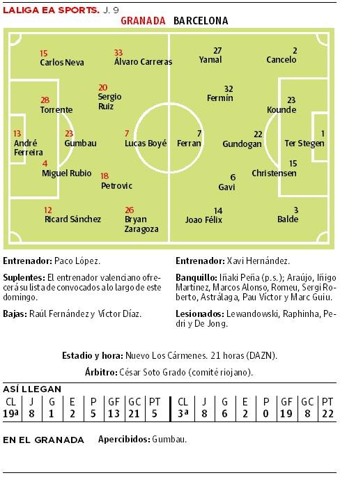 Xavi al parecer duda entre Romeu o Gundogan en el eje, lo que podría dar cabida al joven Fermín junto a Gavi. Atrás, la posibilidad de que descanse Araújo y cuele a Christensen. En lo demás, un equipazo, pero en Granada, ya se sabe, todo es posible.