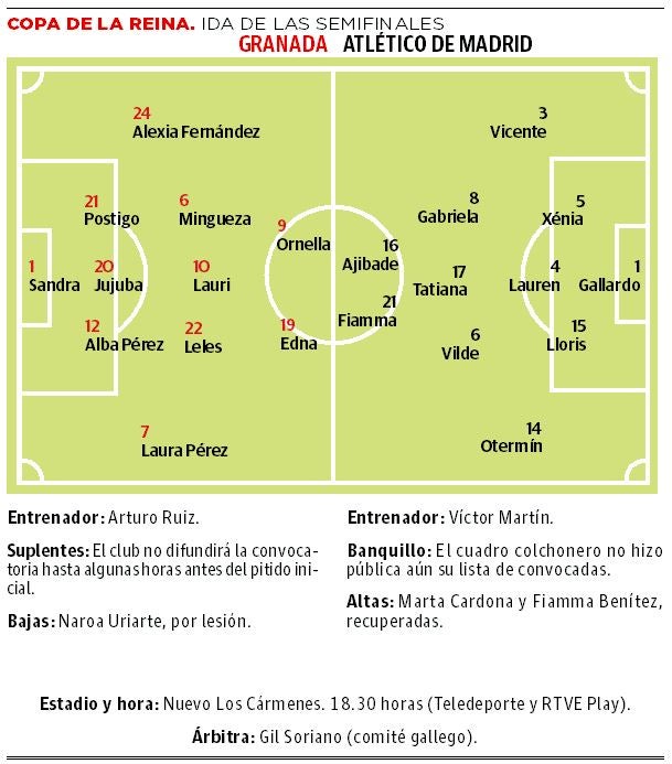 El Granada femenino quiere volver a hacer historia. El conjunto rojiblanco recibe al Atlético de Madrid con motivo del partido de ida de las semifinales ... de la Copa de la Reina (18.30 horas, en Los Cármenes), cota inimaginable a principios de la temporada. La coronó un grupo de jugadoras transformado en toda una máquina de competir, un equipo de autor bajo la firma de Arturo Ruiz. Su buen hacer halló premio, con la gloria más cerca que nunca. La oportunidad de sus vidas.