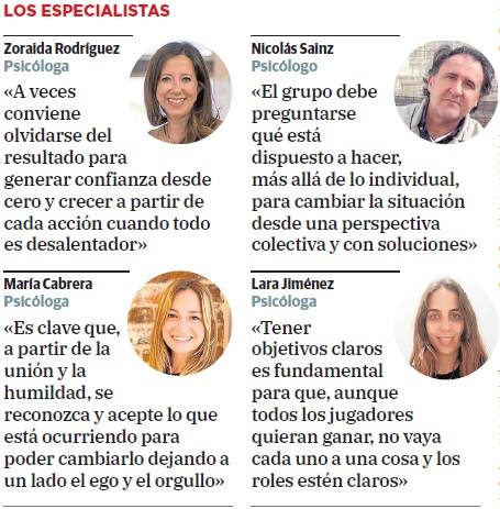 «En ocasiones, también conviene retar a los futbolistas para que, con mucho cuidado y mucha mano izquierda, demuestren quiénes están en el barco y quiénes no para apartar a quienes restan», subraya Zoraida Rodríguez, que procura alejarse del «optimismo ilusorio de Mr. Wonderful». «Habrá quienes sufran impotencia y ansiedad y otros con ofertas y tentación de salir», atisba Nicolás Sainz. «Con juegos o sin ellos, es importante que el equipo genere entusiasmo. Todos los grupos humanos son capaces de cualquier cosa si consiguen ese impacto, y la comunicación es un vehículo maravilloso para ello», sigue Sainz. «Cualquier iniciativa que reconecte a los jugadores entre ellos es positiva», ensalza María Cabrera.