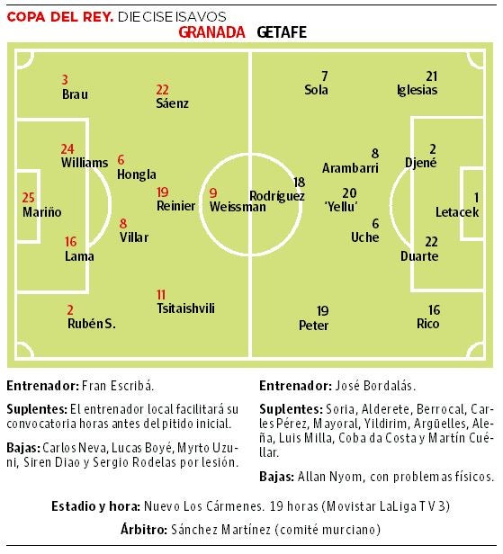 Los tropiezos venideros a domicilio frente al Mancha Real en primera ronda, y Real Oviedo y Arosa en la segunda alejaron la Copa de Granada, cuyo equipo se presenta a la reválida esta campaña con escasa pólvora. Tras el parón navideño, los de Fran Escribá presentan numerosas bajas en su parcela ofensiva. A la ya notificada de Lucas Boyé –fuera de combate desde el duelo con el Cádiz en noviembre por un problema fibrilar en su isquiosural derecho.–, se unieron recientemente las ausencias de Siren Diao y Myrto Uzuni. El propio técnico nazarí confirmó en rueda de prensa que no podrá contar con ninguno de los dos puntas, con molestias y sin participar en el entrenamiento a puerta abierta con tres millares de hinchas en la tribuna de Los Cármenes.