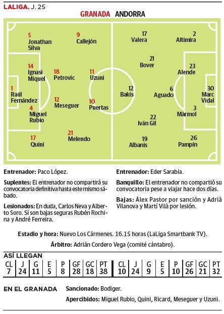 Han pasado veinte jornadas desde la visita a Andorra y, a falta aún de dieciocho, al Granada le queda escaso margen de maniobra. La incapacidad de vencer fuera de Los Cármenes le obliga a ganar en el Zaidín como sea, con más o menos apuros, como sucedió contra el Ibiza sin una actuación convincente del equipo. La visita del Andorra encierra tres nuevos puntos que no puede dejar escapar para volver al 'play off' de ascenso. Sin embargo, el partido presenta distintas complejidades. También propias, más allá de las virtudes del que quizás sea el rival que mejor trata la pelota de la competición.
