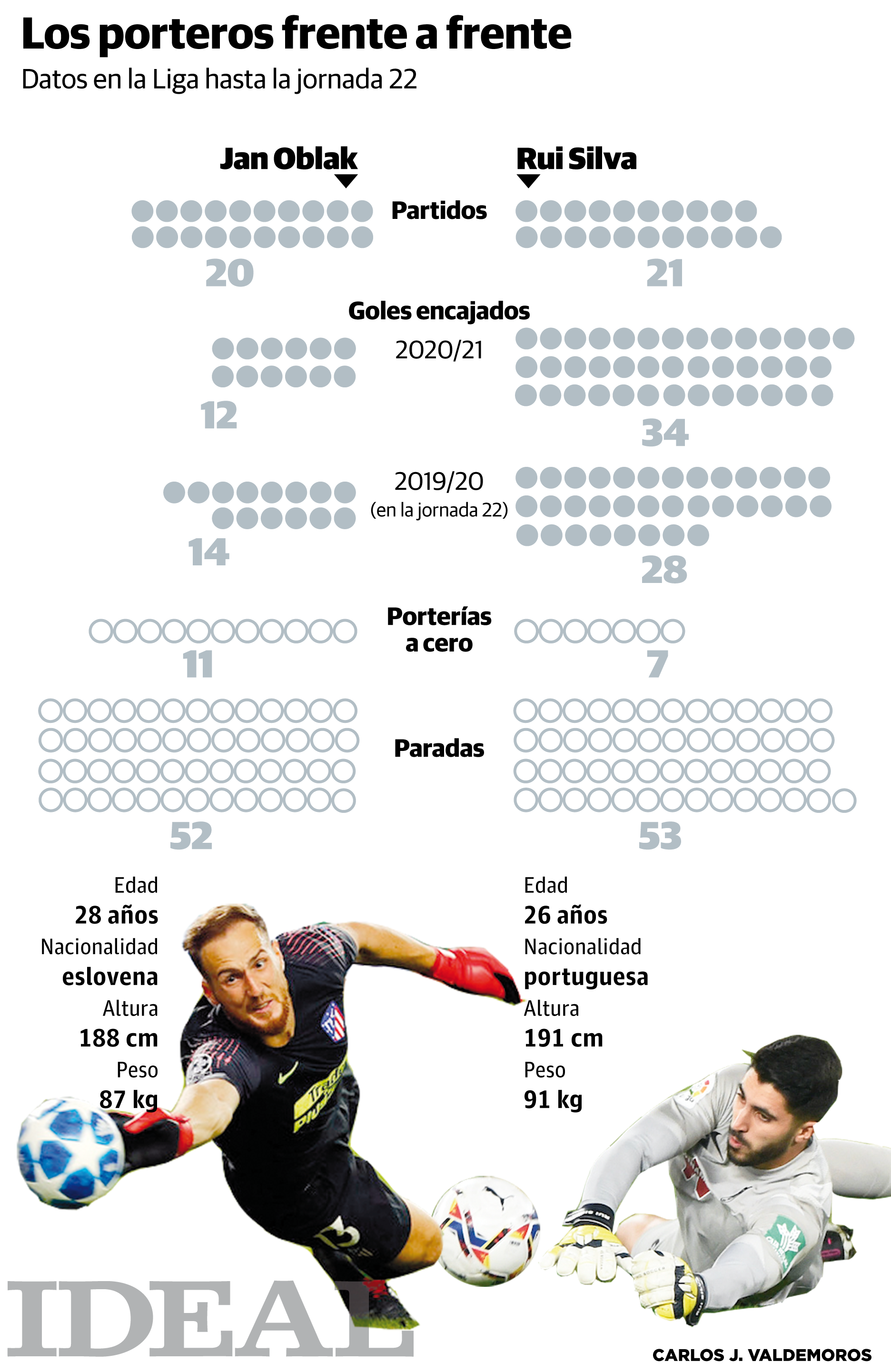 Son registros que acercan a Jan Oblak a su mejor versión, ya que a estas alturas llevaba encajados dos tantos más la temporada pasada. Unos cuantos más ha lamentado Rui Silva, que en 21 partidos ha sufrido 34 goles, el que más de LaLiga –solo los porteros del Betis han recibido más entre Bravo y Joel– por los 28 del curso anterior en los mismos encuentros. Oblak es además el indiscutible rey de la 'portería a cero' de LaLiga, con once duelos intacto; ese ideal que persiguen en cada partido los hombres de Diego Martínez y que por ahora se ha conseguido en siete choques.