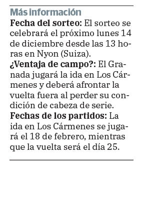 Manchester United, Milan, Ajax, Arsenal, Roma o Nápoles son algunos de los rivales de mayor entidad con los que podría toparse el Granada en los dieciseisavos de final de la competición. Un paso más en los sueños del club y sus aficionados, rendidos a las hazañas de Diego Martínez y su equipo. Un nuevo desafío que los rojiblancos afrontarán desde la competitividad que les caracteriza bajo cualquier circunstancia y sea quien sea su oponente, aunque esta vez con la dificultad añadida, por haber sido segundo, de afrontar la vuelta en el destino que el sorteo le depare, el próximo 25 de febrero, tras disputar la ida en Los Cármenes el día 18.