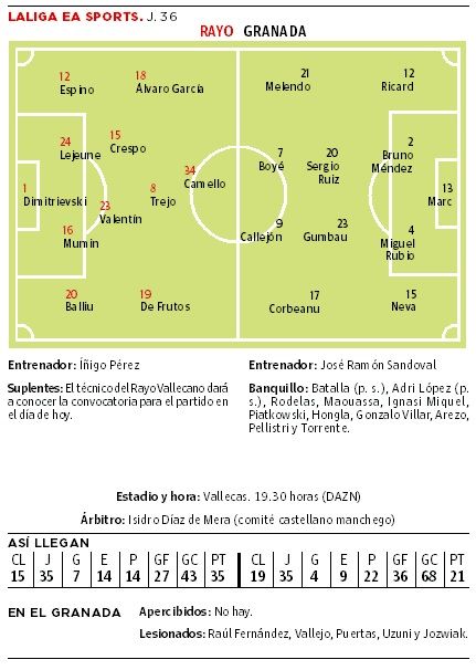 Jozwiak y Uzuni se perderán el resto de la temporada, en la que el Granada ya mira hacia el próximo curso deportivo en Segunda divisiónEl Granada visita este miércoles a partir de las 19.30 horas al Rayo Vallecano en un duelo clave para la permanencia del conjunto madrileño, ... pero intrascendente para los rojiblancos, ya descendidos, que no forzarán a sus jugadores tocados y darán oportunidades a los menos habituales. El entrenador nazarí, José Ramón Sandoval, expresó en la víspera del partido que el portero Marc Martínez será titular en el choque en Madrid. Además, descartó a Myrto Uzuni, Kamil Jozwiak y Augusto Batalla para el resto de la temporada por lesión. «Cuando llegas al final de la temporada en esta situación, los objetivos son claros y es difícil formar un equipo», expuso. «Quiero que el equipo coja la dinámica que mostró antes del partido del Sevilla, con ganas. A Vallecas o vamos así o no lo vamos a pasar bien porque ellos quieren cerrar la permanencia y nosotros tenemos que ir con el espíritu de ser ganadores porque aquel campo te embruja y te hace ser un poco menos», analizó.