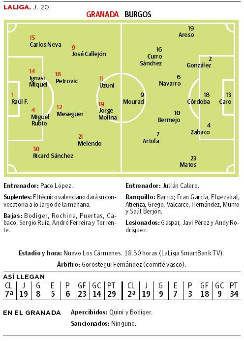 El Granada juega mucho mejor desde que lo dirige Paco López y divierte a sus aficionados, pero sigue sin ganar fuera de Los Cármenes y las cosechas a domicilio son imprescindibles para aspirar al regreso a Primera división por la vía directa. Los rojiblancos han roto a marcar goles con su nuevo entrenador, con once dianas en cinco partidos pese a las ocasiones desperdiciadas el pasado jueves en Málaga por los nueve encuentros de quince sin marcar que se encadenaron con Karanka, pero su fiabilidad defensiva se encuentra bajo sospecha al no haber dejado la puerta a cero más que contra el Albacete, cuando jugó más de media hora con hasta dos hombres más, desde la destitución del técnico vasco. El Burgos, paradigma del equilibrio, es el equipo que menos goles ha marcado entre los ocho primeros al inicio de la jornada, con 18, pero aun así son el doble de los que ha encajado, menos que ningún otro.