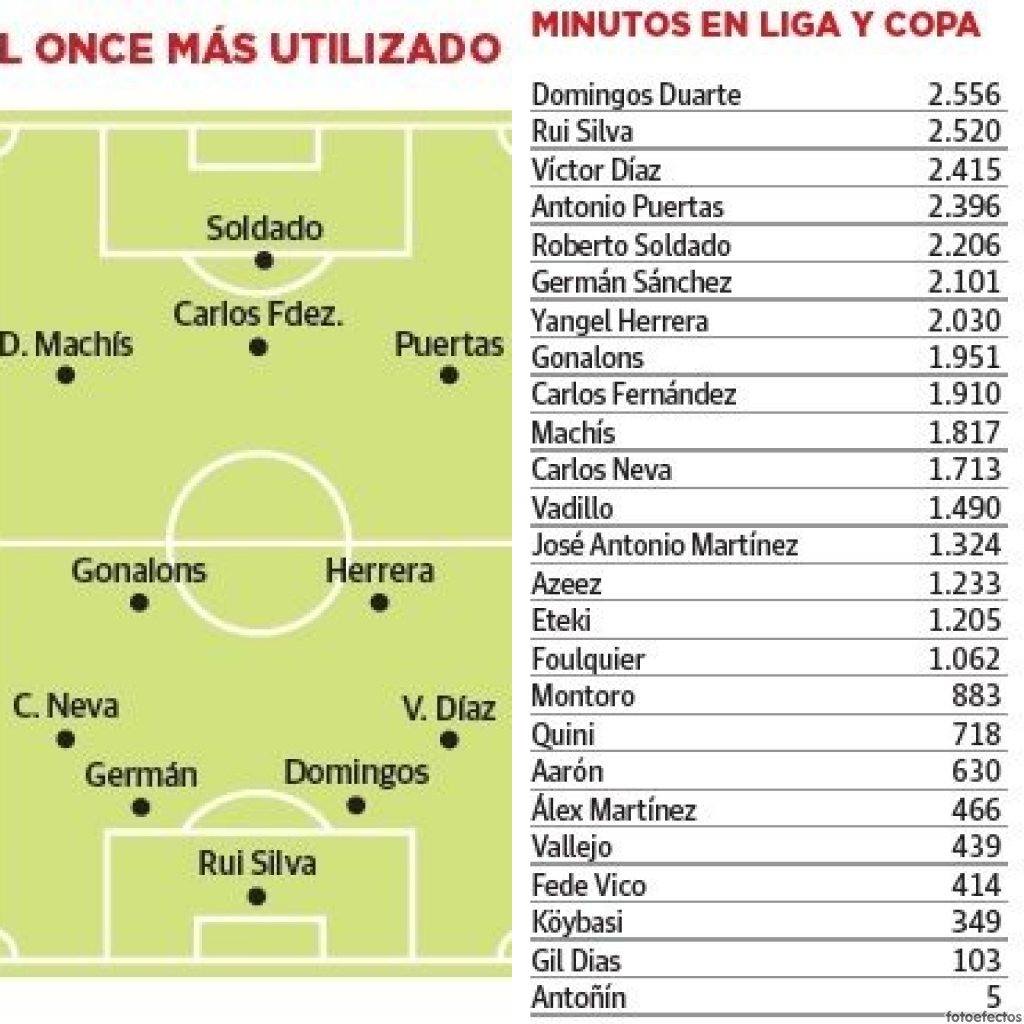 Germán Sánchez aparece como el siguiente en la lista y es el sexto que pasa de la frontera de los 2.000 minutos (en concreto, 2.101). Yangel Herrera cierra este cupo de siete con 2.030, aunque tiene muy cerca a su habitual compañero en el mediocampo, Maxime Gonalons (1.951). En el siguiente escalón, por encima del millar y medio de minutos, también están otros jugadores que forman parte la columna vertebral de la escuadra. Carlos Fernández y Darwin Machís irrumpen tras el pivote francés. El sevillano llega a los 1.910 en 29 encuentros totales. El venezolano se queda con 1.817 en 32 entre Liga y Copa. El hispalense es pichichi del equipo con ocho tantos en el global. El 'avión' ha bombardeado seis veces, todas en Liga.