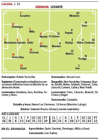 Se la juega ante el Levante, un equipo desacomplejado por llevar meses viéndose en Segunda, pero que con orgullo sigue por el precipicio las directrices de un entrenador que, como Rubén Torrecilla en el Granada, empezó como interino y se terminó quedando. El joven italiano Alessio Lisci pide a sus futbolistas que jueguen como saben, sin miedo, y así ha querido el conjunto granota asomar la cabeza del pozo en el que estaba tras las destituciones de Paco López y Javier Pereira. Ha marcado al equipo con su carácter intrépido e, imprevisible, fía su ataque a un galgo capaz de soñar jugadas maravillosas por más kilómetros que se cargue a la espalda como José Luis Morales, que sigue derramando calidad por todo el frente del ataque a sus 34 años. El exrojiblanco Roberto Soldado se juega una plaza a su lado con Dani Gómez y, de jugar, abriría en la grada el debate de si merece o no los aplausos por su contribución al ya legendario 'EuroGranada' pese a su abrupta salida tras el pago de un cláusula liberatoria.