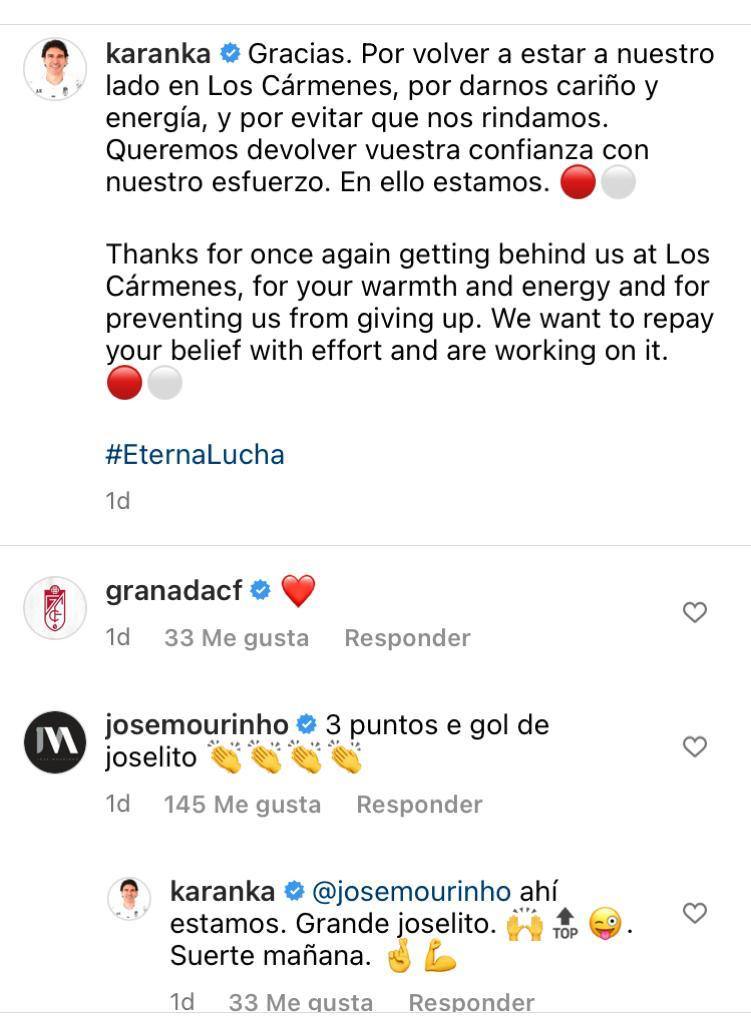 José Mourinho permanece atento a la actualidad del Granada por su amistad con Aitor Karanka, quien fuese su mano derecha en el Real Madrid. Tras ... el triunfo ante el Racing de Santander en Los Cármenes, el entrenador portugués ahora en la Roma volvió a felicitar al técnico rojiblanco en la red social 'Instagram' con un cariñoso mensaje en el que además celebró el gol de 'Joselito' Callejón para abrir la lata ante el conjunto cántabro.