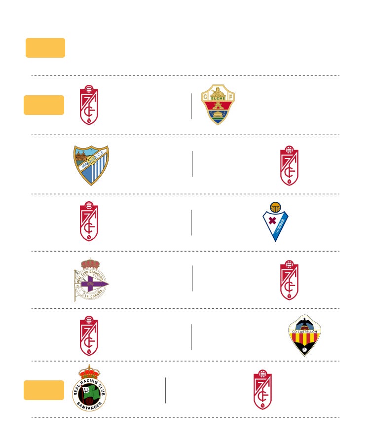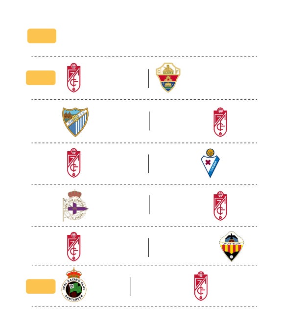 Más allá de recibir al Elche este sábado, el Granada tendrá que visitar al Racing en la última jornada. Además, recibirá al Eibar y al Castellón y visitará al Málaga y al Deportivo. Sexto con 58 puntos, tendrá que mantener la línea actual de victorias para volver a Primera división.
