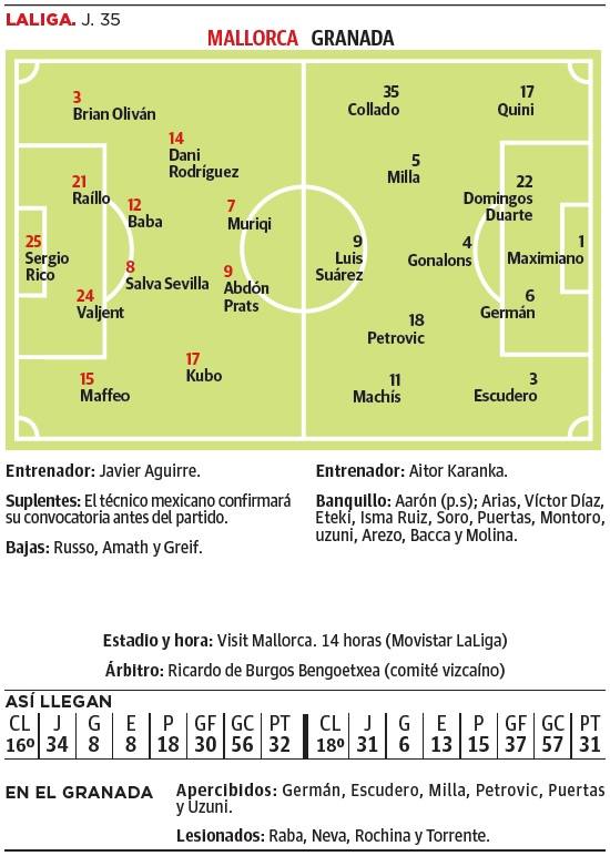 Como claves generales, el Granada se afanará en soportar el presumible redoble de tambores del Mallorca en los primeros minutos para asegurar, sobre todas las cosas, la portería de Maximiano a cero. Después, saber gestionar las siguientes fases, tanto las de sometimiento como las de iniciativa. La incidencia en las áreas y el buen uso de las sustituciones conforman otros elementos de un mosaico incierto. Ganando no estará todo hecho, pero dará alivio y moral. Perdiendo se acerca la extremaunción.
