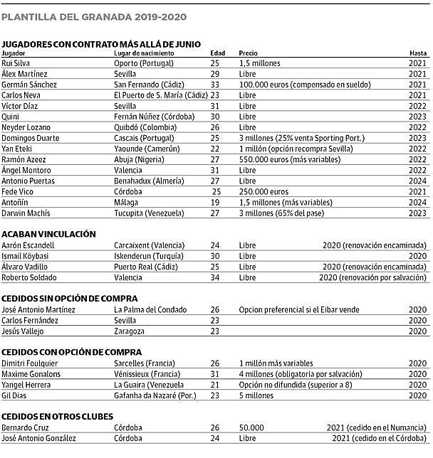 Hasta 2022 se va la relación de Yan Eteki, Ramón Azeez, Neyder Lozano, Víctor Díaz y Ángel Montoro. Por los dos primeros, el club pagó un traspaso (1 millón por el camerunés, 550.000 euros más variables por el nigeriano). En 2023 cierran Quini, que llegó libre; Domingos Duarte, 3 'kilos' con el 25% de una futura venta para el Sporting de Portugal; y Darwin Machís (3 por el 65% de su pase al Udinese). El defensa luso también está siendo seguido por cuadros de su tierra y de Inglaterra. Su cláusula es de 15 también. El Granada no facilitaría su marcha. Por último, Puertas y Antoñín son elementos atados a largo plazo. Sus firmas se estamparon hasta 2024.