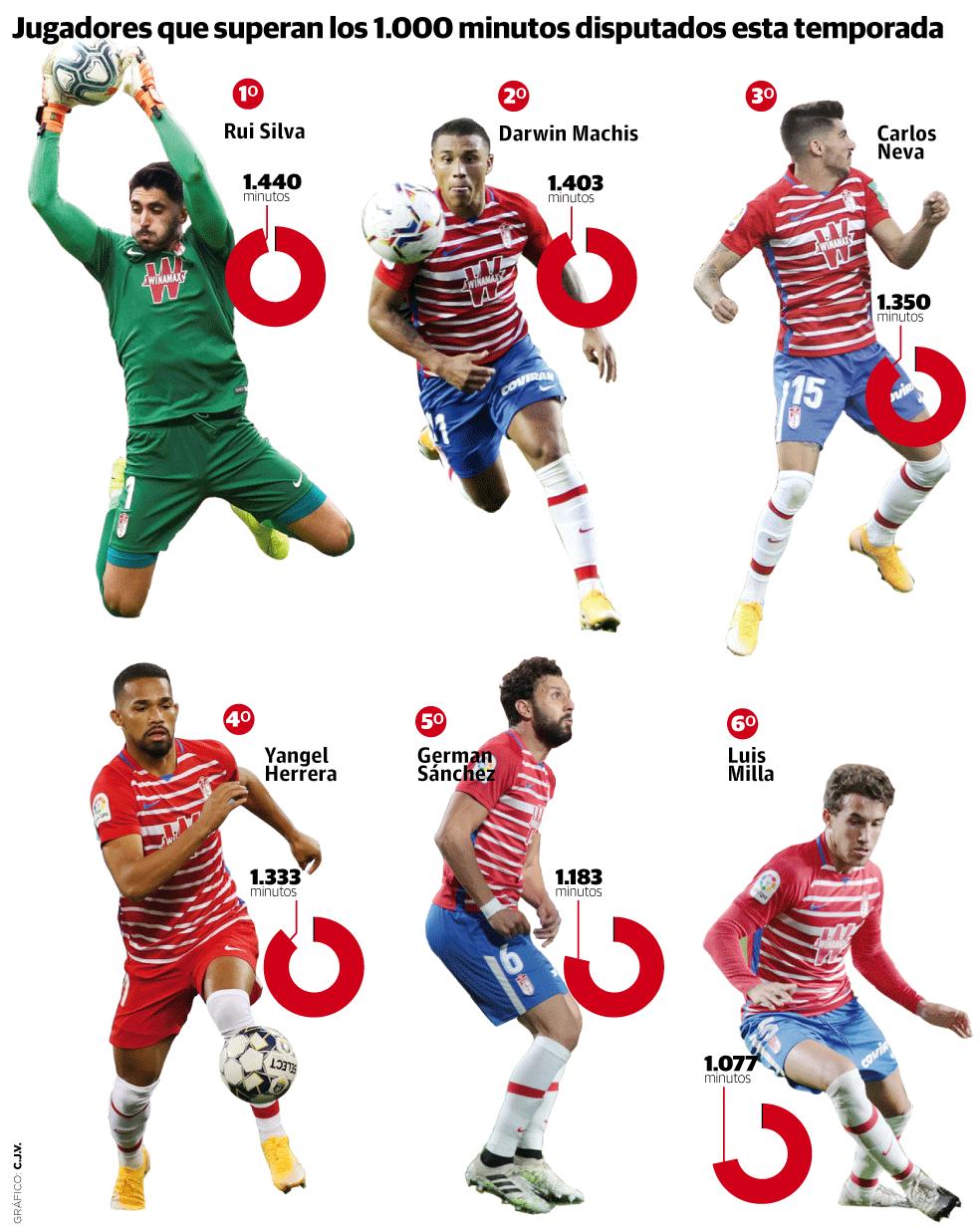 Los síntomas de cansancio son evidentes en el Granada. La carga de partidos y la acumulación de minutos de algunos de sus futbolistas resulta muy ... alta. Los exámenes médicos a los que se somete la plantilla periódicamente encienden la alarma sobre el riesgo de lesión muscular al que se están abocando los jugadores más utilizados. Índices que preocupan ante la perspectiva de afrontar ocho partidos oficiales antes del final de 2020.