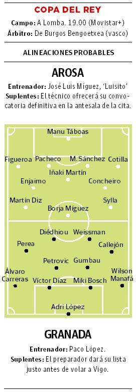 No será sencillo, aunque el contrincante, el Arosa, milite en la 3ª RFEF (dos menos que el filial rojiblanco) porque en un torneo así, a un partido y en el campo del rival más débil, ciertos factores se equilibran. Si el Granada no es capaz de fajarse con viveza e intensidad, no es descabellado pensar en una sorpresa negativa. Aunque vaya a actuar sobre césped natural, las intensas precipitaciones caídas sobre Pontevedra convierten el escenario en inhóspito para los nazaríes. Hasta el balón cambia en la competición del KO, más duro que el habitual.