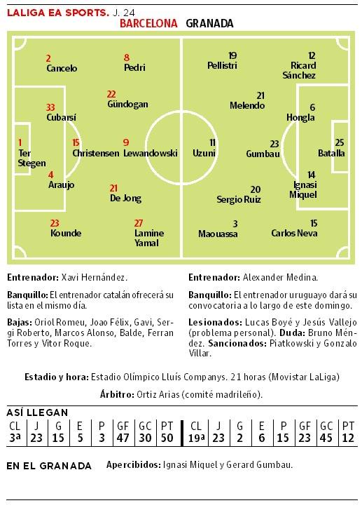 En el Barça, vuelve Ter Stegen bajo palos, uno de los futbolistas más influyentes para lograr la última Liga. Parece que Xavi seguirá apostando por Christensen como mediocentro y por Lamine Yamal como extremo, arropando en la vanguardia Lewandowski. Están los azulgranas en un momento de incertidumbre, con la anunciada marcha del entrenador a final de temporada y una situación económica preocupante. Un ambiente raro, con el asunto Negreira y algunas quejas arbitrales de fondo, pero un equipo con un escaparate lujoso ante un Granada en estado crítico. Lo mínimo será competir.