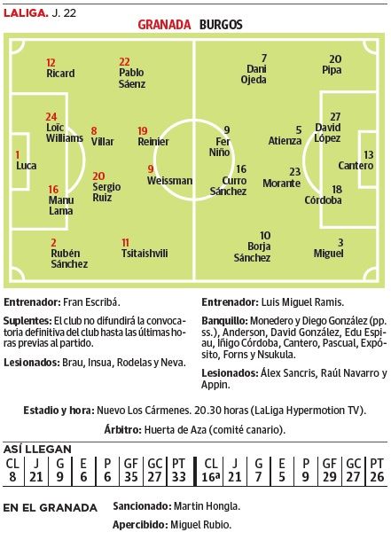 Lo normal es que Shon Weissman y Reinier vuelvan a compartir el ataque del Granada, como contra el Getafe en Copa siete días atrás, pero el regreso de Boyé parece agua en el desierto aun sin haber roto a marcar aún de rojiblanco. El 'caso Uzuni' y la dependencia extrema que el equipo viene mostrando de su goleador han de incentivar al argentino, uno de los que le supera en la escala salarial que el albanés cuestiona, para reencontrarse con esa versión que todavía no ha terminado de mostrar desde su fichaje. Capitán por delante del propio Uzuni, la visita del Burgos parece propicia para su vuelta.