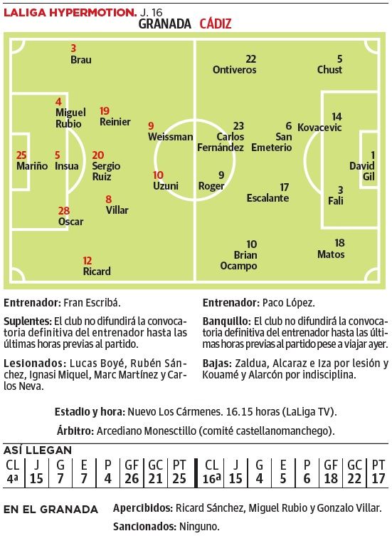 La vuelta a Los Cármenes de un viejo amigo del Granada y también de Fran Escribá, Paco López, ahora al frente del Cádiz, depara un ... dilema futbolístico al actual entrenador del equipo rojiblanco. Excompañeros en el modesto Torrent valenciano hace 34 años, ambos trataron de no darse pistas con respecto a las dudas que sobrevuelan sus alineaciones titulares. Las de los anfitriones, en concreto, pasan por la zaga de tres centrales que tan bien funcionó la pasada jornada en El Molinón y la participación de fatigados internacionales ausentes en esa meritoria victoria como Myrto Uzuni ante bajas como la de Lucas Boyé además de las de Rubén Sánchez e Ignasi Miquel por precaución de cara a otro derbi, el del sábado que viene en Almería.