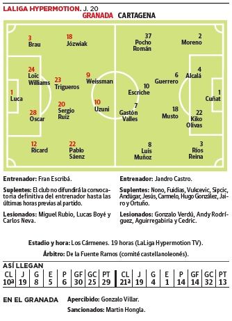 Perder en Oviedo dejó al Granada sin red por la vuelta inmediata a Primera división. La Segunda no espera a nadie y aunque el Racing ... pinche, los que luchan por el 'play off' no permiten que nadie se despiste. Los rojiblancos están obligados a ganar al Cartagena en Los Cármenes por la despedida del año en casa para volver ahí y acercarse al ascenso directo, con la asignatura todavía pendiente de hacer de su estadio un fortín mientras flaquea fuera. Fran Escribá tendrá la baja de Martin Hongla por sanción al cumplir ciclo de amonestaciones –por él podría volver a la convocatoria el canterano Juanma, presente en el último entrenamiento– y junto a ese, forzoso, sopesa otros cambios ineludibles por el cansancio de otros antes de la batalla del sábado con el Eibar en Ipurua.