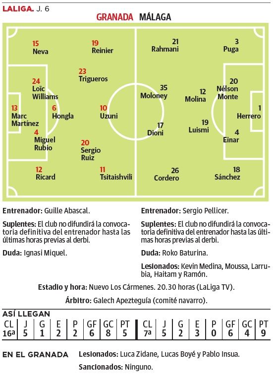 Al Granada le urge ganar ante su afición de una vez y no de cualquier manera, sino redefiniéndose como equipo. Da la sensación de que Abascal quiso que su equipo tuviera más el balón en las tres primeras jornadas que en las dos últimas, coincidiendo quizás con la ausencia de Hongla como uno de los futbolistas predilectos del entrenador en la plantilla. Con este de vuelta, toca ver si reformula el sistema de tres centrales para reforzar a Sergio Ruiz y Manu Trigueros en un centro del campo muy mermado sin el camerunés por más que Reinier esté llamado a colaborar también ahí, mientras Giorgi Tsitaishvili afila el otro perfil. En punta, Myrto Uzuni está llamado a sentar a Shon Weissman. Además del albanés, también Gonzalo Villar o Rubén Sánchez piden oportunidades de inicio.