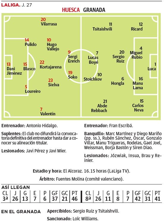 Únicamente el Huesca mejora al Granada en las tres últimas jornadas, con pleno de victorias ante Córdoba y Castellón fuera y Cartagena en El Alcoraz. Humiles pero muy organizados y con Soko como velocista arriba, los oscenses encadenan once partidos de Liga sin perder desde que lo hicieran en casa del Eldense en noviembre y no caen como anfitriones desde septiembre con el Burgos la única vez que no marcaron esta temporada. Un precedente al que pueden agarrarse los rojiblancos, que ahora encadenan dos porterías a cero. Después del 'caso Uzuni' y de la destitución de Matteo Tognozzi como director deportivo, al Granada le urge una victoria para volver a creer en el ascenso. El Alcoraz presenta un escenario idóneo, pero habrá que pelearlo con uñas y dientes.