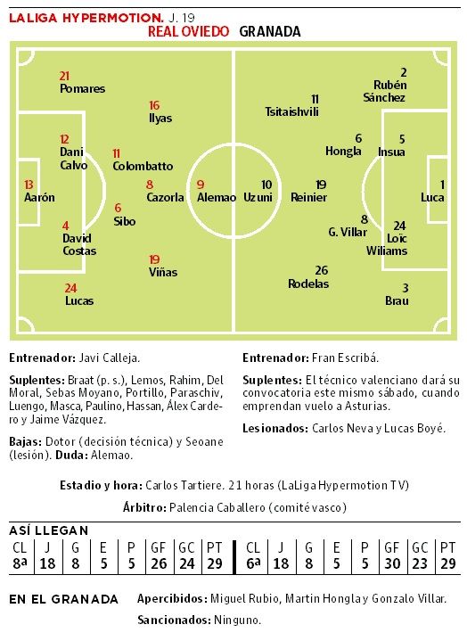 Aunque el martes vuelva a competir y el sábado que viene viaje al siempre hostil estadio de Ipurua, nadie puede mirar más allá del encuentro en tierras asturianas. El equipo rojiblanco recupera a Ricard Sánchez tras su sanción por acumulación de amarillas, pero apunta a estar en el banquillo. Rubén Sánchez ha concitado méritos para proseguir como titular. Seguramente intercambiarán papeles con el Cartagena en Los Cármenes. Ricard también puede ser una opción ante el Oviedo como extremo cuando se desfonde Tsitaishvili.