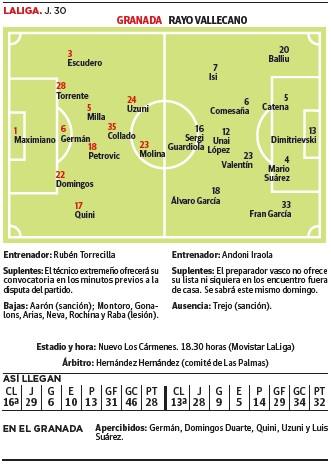 El Granada, con un Torrecilla que parece fiel a sus tres centrales y que se quiere reafirmar en el puesto, espera cobrarse la revancha ante un Rayo que le hundió en VallecasLa controversia en el entorno del Granada sobre la idoneidad de jugar con tres centrales no parece preocupar a Rubén Torrecilla. El técnico está convencido ... de que asentará este sistema como una variante habitual para su equipo. Será así con trabajo, insistencia y tiempo; el que le brindaría la continuidad hasta final de temporada. Tiene todos los visos de que será así, aunque para extinguir la interinidad necesita el refrendo de una victoria ante el Rayo Vallecano, un recién ascendido al que se le está haciendo larga la temporada tras un comienzo fulgurante, en el que precisamente machacó a los rojiblancos.
