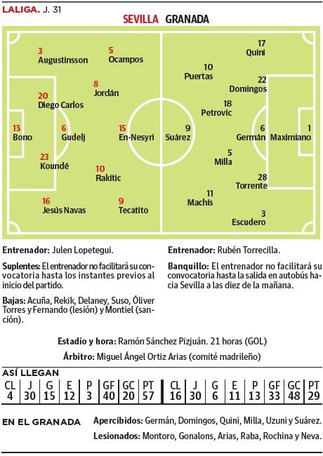 El Granada acude al Pizjuán con cinco piezas clave al borde de la sanción pero sin pensar en la próxima visita del Levante a Los CármenesNo había perdido aún el Sevilla en Liga cuando visitó Los Cármenes el pasado 3 de octubre, e hincó la rodilla. Sigue sin caer el ... conjunto de Nervión en el Sánchez Pizjuán, pero el Granada quiere emular lo que hizo entonces y convertirse en el primer visitante en vencer allí. Es su reto esta noche, necesitado de puntos que amplíen la distancia de tres que guarda con los puestos de descenso, aunque pase lo que pase no caerá a la zona fatídica al final de esta jornada al menos. No jugará esta vez, ni lo volverá a hacer hasta la próxima temporada, el autor del gol que decantó el derbi andaluz de la primera vuelta: Rubén Rochina. Los rojiblancos, no obstante, guardan otras armas. Sin embargo, la amenaza de sanción que pesa sobre cinco importantes hombres apercibidos puede trastocarles ante la siguiente visita del Levante a su estadio.