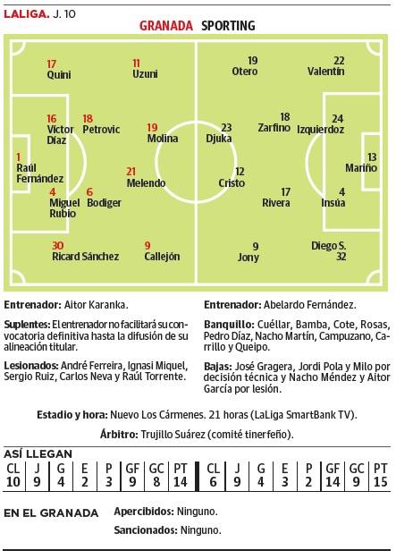 Aitor Karanka desea estabilizar a su equipo en todos los sentidos desde este jueves ante el Sporting de Gijón en Los Cármenes. El Granada necesita ... una victoria que se le escapa desde hace tres partidos para recuperarse en la clasificación y respaldar a su entrenador y este a su vez pretende consolidar una columna vertebral demasiado castigada en las últimas jornadas por las curvas que ya advirtió el vasco que llegarían. Esta vez, Karanka tiene en su mano la posibilidad de repetir el mismo 'once' titular del encuentro anterior, ante la Ponferradina, si así lo quiere sin verse obligado a novedad alguna siempre y cuando Óscar Melendo se encuentre apto después de las ligeras molestias que sintió en El Toralín.