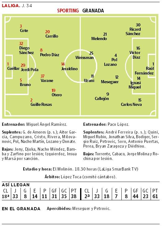 Al Granada le evoca un grato recuerdo volverse a cruzar con el Sporting, frente al que firmó su actuación más contundente de la temporada. Entonces, ... venía el equipo de dos empates sin goles seguidos con Aitor Karanka cuando aterrizó en Los Cármenes el cuadro gijonés. Los de rayas horizontales se dieron un atracón. Le metieron un 5-0 a unos asturianos que, en aquel momento, aún dirigía Abelardo Fernández, con el objetivo marcado desde los despachos de disputar el 'play off'. El tiempo ha pasado y ambos conjuntos han cambiado de técnicos. Mientras los nazaríes están en la zona que les corresponde por presupuesto, los asturianos languidecen y se preocupan por no caer en la quema de cuatro equipos que bajan de categoría. Una decepción.