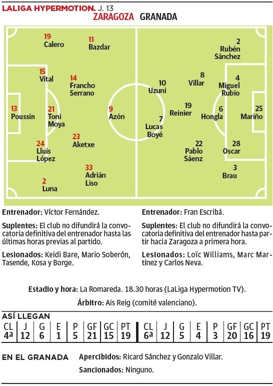 Fran Escribá sabe bien lo que se cuece en Zaragoza, al medirse de hecho al entrenador que allí le sustituyó: Víctor Fernández. Los maños sueñan con la vuelta a Primera división cada temporada, y así llevan ya una década, cargada de una irregularidad futbolística que ni el temple del ahora técnico del Granada pudo orientar. Los anfitriones perdieron sus tres últimos partidos en casa, con Castellón, Almería y Racing de Santander, pero también fueron capaces de ganar precisamente al Levante e incluso de golear al Elche antes. Llevan, de hecho, una victoria más que los visitantes aunque tres empates menos que lamentaron con derrotas hasta las cinco que acumulan. Aunque los dos equipos suman los mismos puntos, es el Zaragoza el que supera al Granada en la clasificación por dos posiciones como cuarto también dentro del 'play off'.