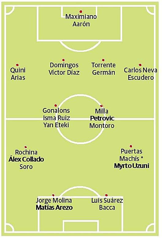 Los 23 con dorsal del primer equipo serían los porteros Maximiano y Aarón; los defensas Quini, Arias, Domingos Duarte, Víctor Díaz, Germán, Carlos Neva y Escudero; los centrocampistas Gonalons, Eteki, Milla, Petrovic y Montoro; los extremos (o mediapuntas) Rochina, Soro, Puertas, Uzuni y Machís (hasta que salga); y los delanteros Jorge Molina, Matías Arezo, Luis Suárez y Carlos Bacca. Plantilla larga, algo que a priori no gusta al entrenador, pero en la que hay un lesionado de media duración, Arias, y varios elementos que cuentan poco, como Soro, Eteki o Bacca, este último a raíz de las últimas incorporaciones, en teoría.