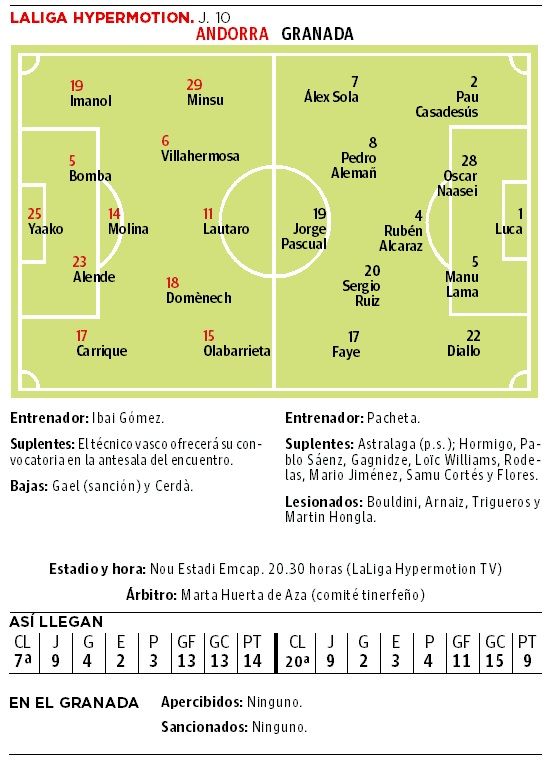 En el centro, las soluciones se limitan. Hongla ha vuelto 'tocado' –no se sabe dónde– de su estancia con Camerún, después no disputar ni un minuto en los encuentros de su combinado. Además, Manu Trigueros ha sufrido un percance con una muela que ha requerido unos días de reposo. Ellos se unen a las bajas de Mohamed Bouldini, que tiene para seis semanas pero con el que Pacheta es optimista de que rebaje el periodo de convalecencia; y José Arnaiz, al que le aguarda una quincena hasta tener firme la rotura fibrilar que sufrió la semana pasada. Por todo ello, los recreativistas Flores –central– y Mario Jiménez –pivote– entraron en la lista. El Granada vuelve a abrir la jornada y buscará salir de la zona que quema.