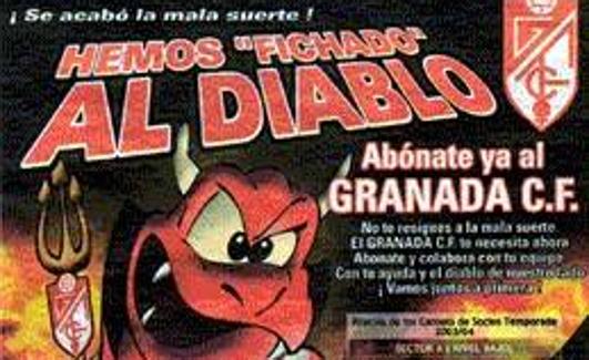 La primera temporada en la que el Granada jugó en la cuarta categoría nacional parecía que iba a tener un final feliz porque el conjunto granadino necesitaba ganar en casa su último partido de la liguilla de ascenso al Quintanar del Rey y el marcador del Nuevo Los Cármenes reflejaba un valioso resultado de 1-0 en el minuto 90. Aquel encuentro no terminó nada bien para los intereses del club porque el granadinista Juanjo se marcó un gol en propia puerta en el minuto 92 y el Granada, con aquel 1-1 ante el conjunto castellano-manchego, se quedó sin el ansiado ascenso. La directiva del club por aquel entonces, encabezada por el presidente Pedro Ruiz, intentó esquivar el gafe que parecía perseguir al club con una agresiva campaña de abonos para la temporada 2003/04 en la que el Granada se jactaba de haber fichado al diablo para acabar con la mala suerte. «Con tu ayuda y con el diablo de nuestro lado, ¡vamos juntos a Primera», decía el eslogan publicitario.
