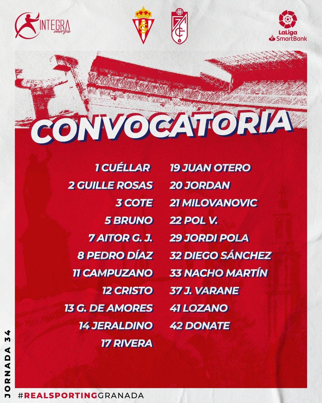 El Sporting de Gijón difundió una convocatoria de 21 futbolistas, con seis canteranos debido a las ausencias. Estos son Jordi Pola, Diego Sánchez, Nacho Martín, Varane, Lozano y Donate. Se presume que al menos tres de ellos pueden ser titulares. Como bajas, los asturianos tienen a Jony, Djuka, Nacho Méndez, Bamba y Zarfino por lesión; y a Izquierdoz, Insua y Marsá por sanción.
