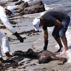 Miembros de la Media Luna Roja comprueban el estado del cuerpo sin vida de un inmigrante en la costa de Libia.