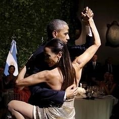 Al término de la cena de Estado, Obama y su esposa, Michelle, observaron con gran atención como una pareja de bailarines de tango se movía con precisión en un pequeño espacio abierto delante de su mesa. En uno de los momentos más sorprendentes de la noche, el presidente de Estados Unidos se levantó y se desplazó de un lado al otro junto a la bailarina, dando incluso algunos giros, mientras que la primera dama hizo lo mismo con el bailarín.