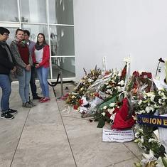 Un grupo de turistas observan los ramos en memoria de las víctimas.