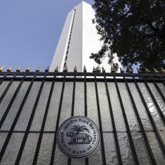 Vista del logotipo del Banco de la Reserva de la India, en Bombay.