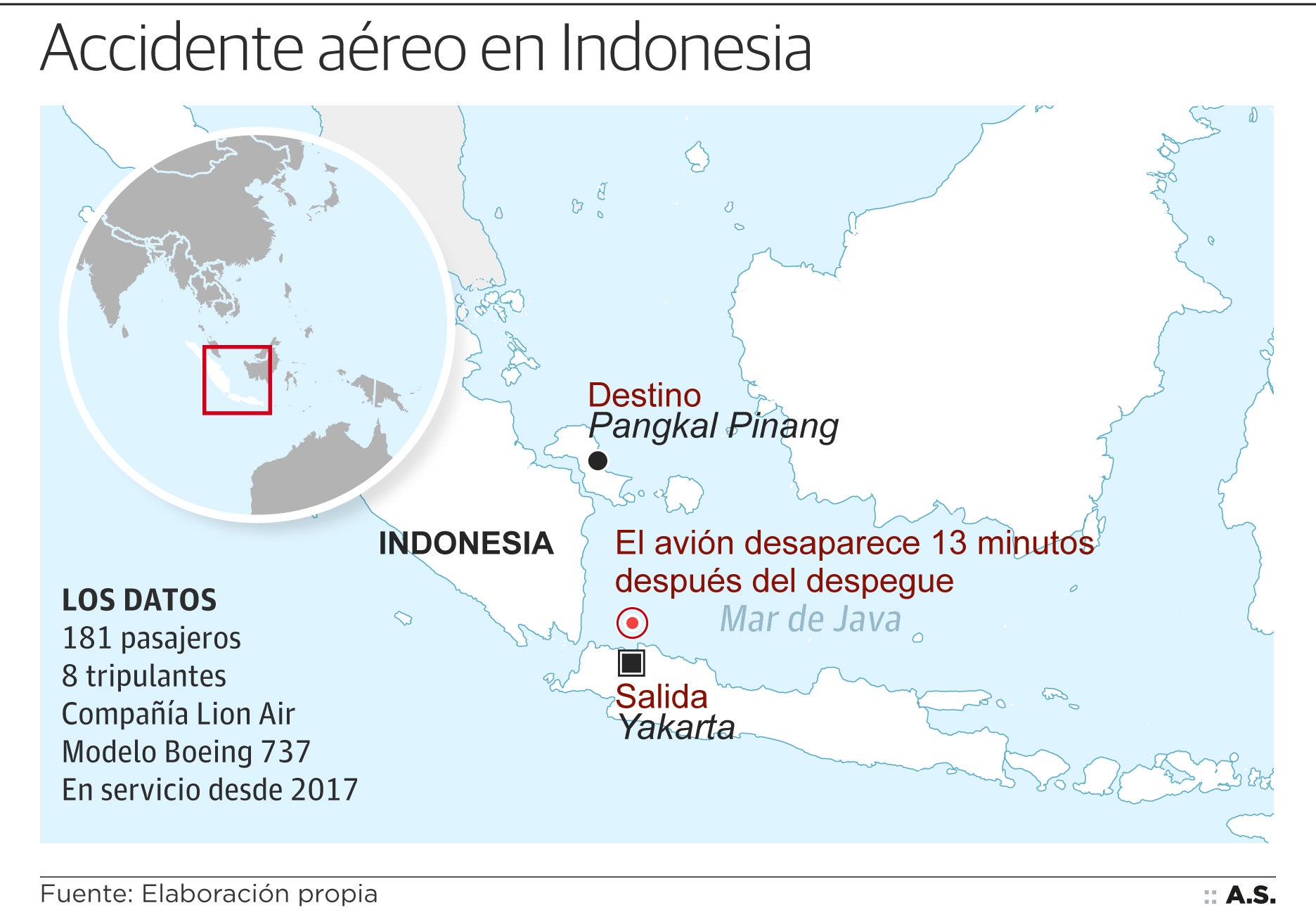 El Boeing 737 que operaba el vuelo JT610 despegó este lunes de Yakarta, la capital de Indonesia, a las 6:20 horas. Tendría que haber ... llegado a su destino, Pangkal Pinang, en poco más de sesenta minutos. Sin embargo, los pilotos declararon una emergencia por un fallo técnico cuando apenas llevaban diez minutos de vuelo. Aunque los controladores dieron permiso para que el avión de Lion Air diese la vuelta, la tripulación fue incapaz de controlarlo y el aparato se estrelló en el mar, al norte de la isla de Java, a las 6:33 horas.