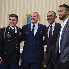 Obama posa con Spencer Stone (centro) y sus compañeros Anthony Sadler (d) y Alek Skarlatos (i).