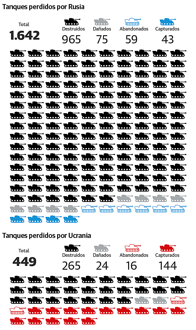 Un tanque es uno de los elementos más poderosos y a la vez más vulnerables del campo de batalla. Su blindaje y su capacidad de destrucción le convierten en un elemento clave para la conquista del terreno. Pero sus necesidades de combustible y repuestos, además de su vulnerabilidad a todo tipo de artefactos explosivos, lo convierten en uno de los puntos débiles del esfuerzo de batalla. Por ello, por ejemplo, lo más habitual es que un blindado luche rodeado de soldados a pie dispuestos a protegerlo. El hecho de que los comandantes rusos hayan enviado al frente a tanques sin la protección de infantería ha supuesto que una de las imágenes icónicas de la guerra sea la de la torreta de un tanque de Moscú destrozada y separada del tanque después de que una emboscada ucraniana con cohetes antitanque haya hecho explotar la munición situada en el interior del vehículo.