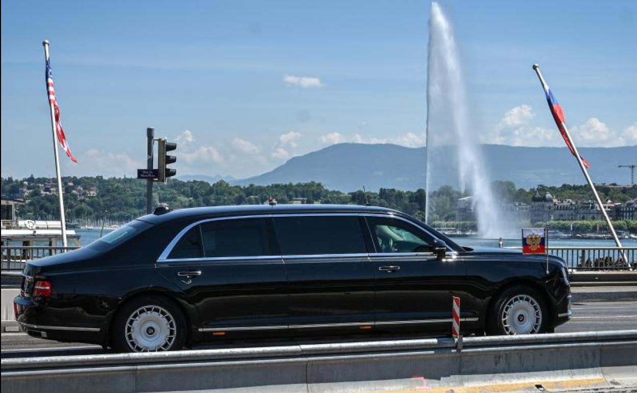 La flamante limusina Aurus de Putin, completamente blindada y de fabricación rusa aunque una réplica del Rolls Royce británico, y la otra docena de vehículos negros con la comitiva de guardaespaldas entraron a las 13.05 horas en los parques públicos de La Grange y Eaux-Vives, vecinos entre sí, que acogen a la villa del siglo XVII dentro de sus treinta hectáreas. El líder ruso fue recibido por su homólogo suizo, Guy Parmelin, sobre una alfombra roja desplegada en las escaleras y flanqueada en ambos lados por las banderas de Rusia, EE UU y Suiza, además de macetas de flores. Tras el protocolario saludo ambos entraron al palacio construido por la familia de banqueros Lullin.