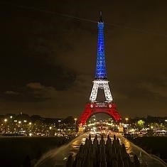 Vista de la torre Eiffel iluminada con los colores de la bandera nacional francesa en París.
