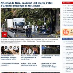 Así, 'Le Monde' encabeza su portada con los ataques titulando "Atentado de Niza, en directo: 84 muertos, el estado de emergencia prolongado tres meses más" con una fotografía en la que se puede ver el camión con impactos de bala juntos a efectivos de la Gendarmería francesa. También 'Le Figaro' ofrece en su portada información sobre el suceso con el titular "Atentado de Niza: El conductor del camión formalmente identificado". El diario 'Liberation' encabeza su portada con el titular "Ataque de Niza: 84 muertos, según un nuevo balance", mientras que 'Le Parisien' opta por un titular que dice "Atentado de Niza: 84 muertos, tres días de duelo nacional".